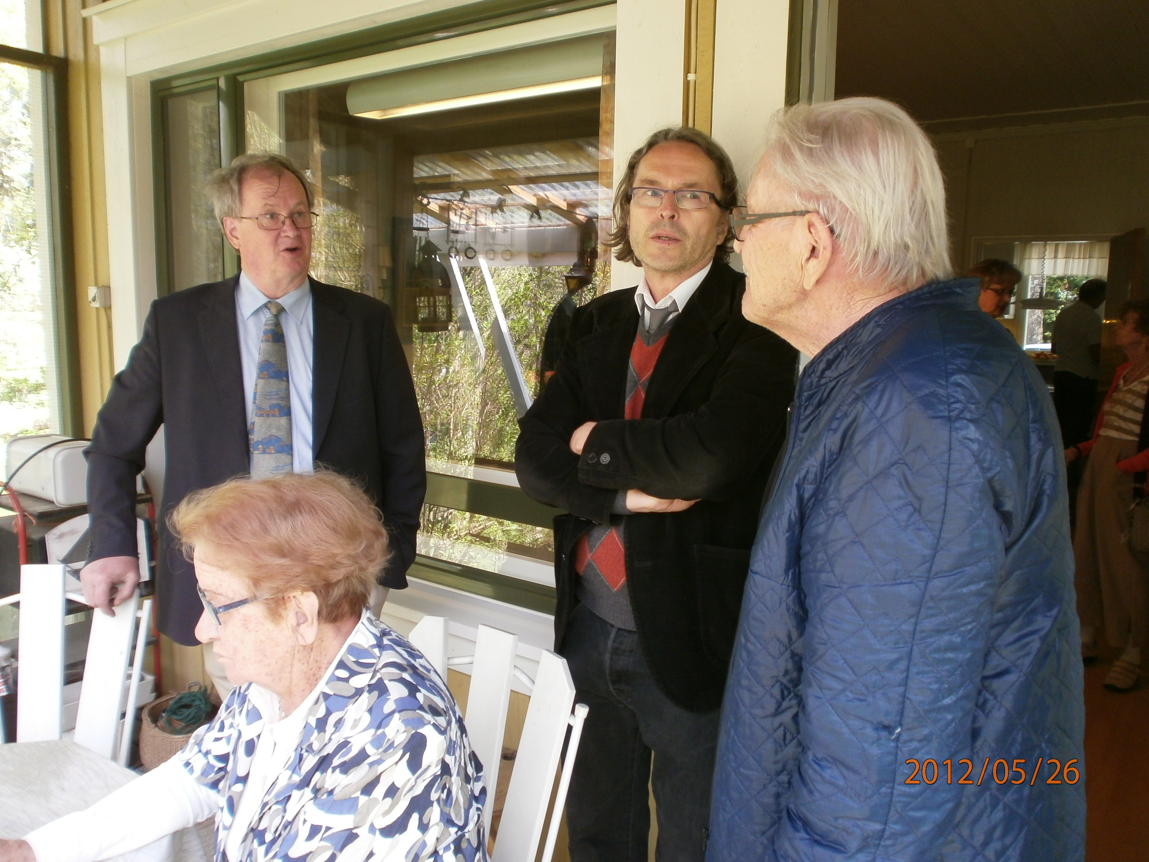 Terassilla Kaija Kangasmaa, Jussi Simpura, Timo Mattila ja Kalevi Mattila.